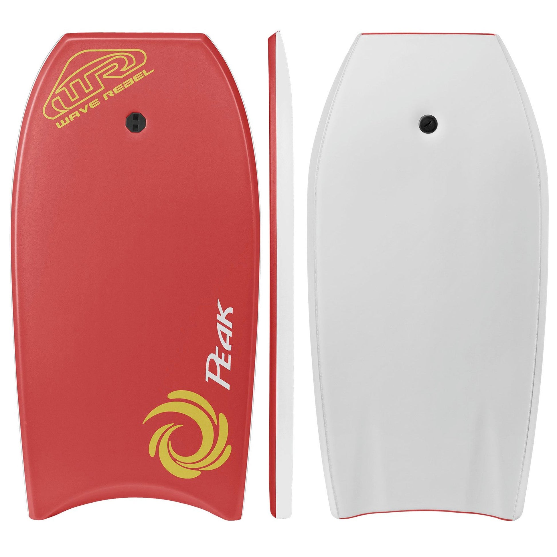 The Wave Rebel Peak Bodyboard is a fun, affordable way to catch waves! This entry level board has channel bottoms to facilitate water flow and for speed. The Peak comes with a leash so the board doesn't get away from you if you fall off. The soft XPE deck makes it comfortable to lie on. The crescent tail grabs the wave face and the EPS core makes it rigid to aid in turning across waves and the slick bottom helps for glide and speed.