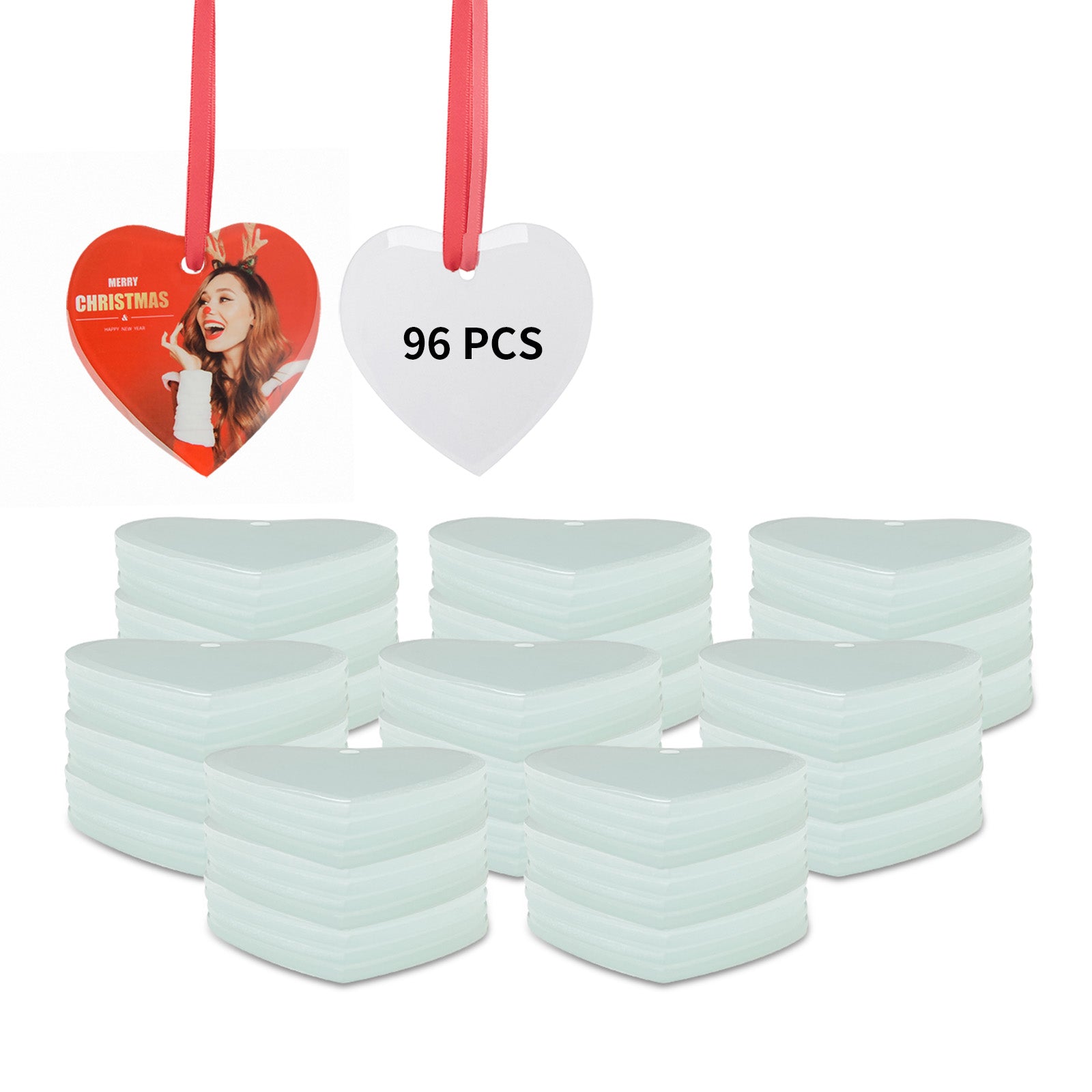- Specification:Each sublimation heart-shaped glass ornament is 3 Inch,each piece with red ribbon,24 pieces packing with one big white box,outside with the brown gift box.