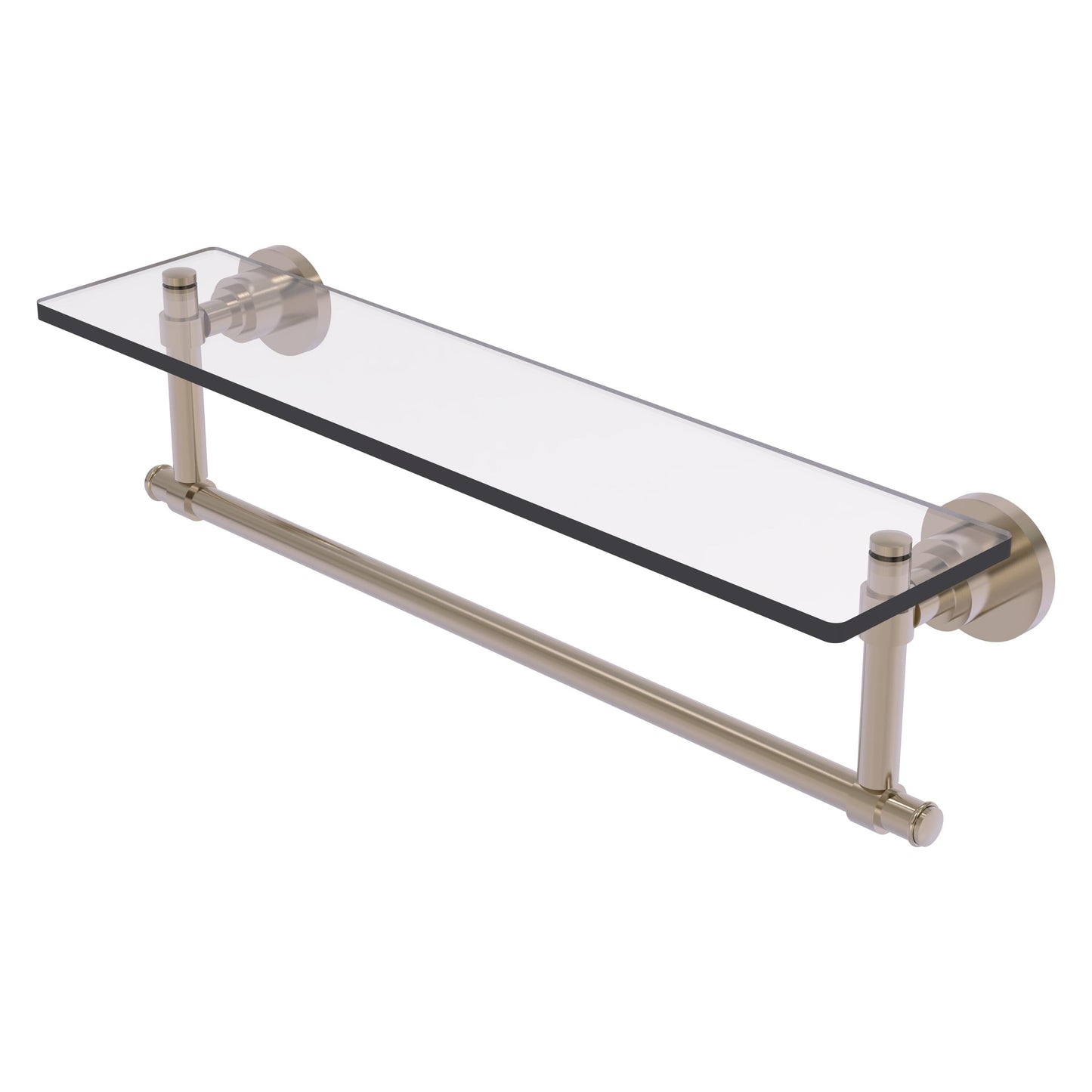Add space and organization to your bathroom with this simple, contemporary style glass shelf. Featuring tempered, beveled-edged glass and solid brass hardware this shelf is crafted for durability, strength and style. One of the many coordinating accessories in the Allied Brass Washington Square Collection, this subtle glass shelf is the perfect complement to your bathroom décor.